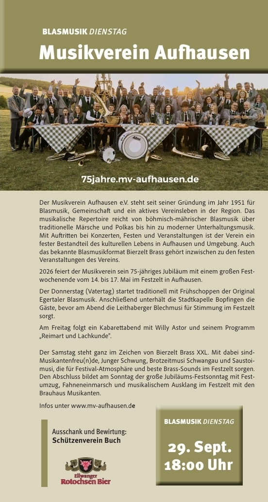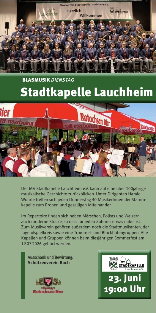 Wir haben dieses Jahr wieder 2 Termine an denen wir die Blasmusikdienstage am Bucher Stausee bewirten.