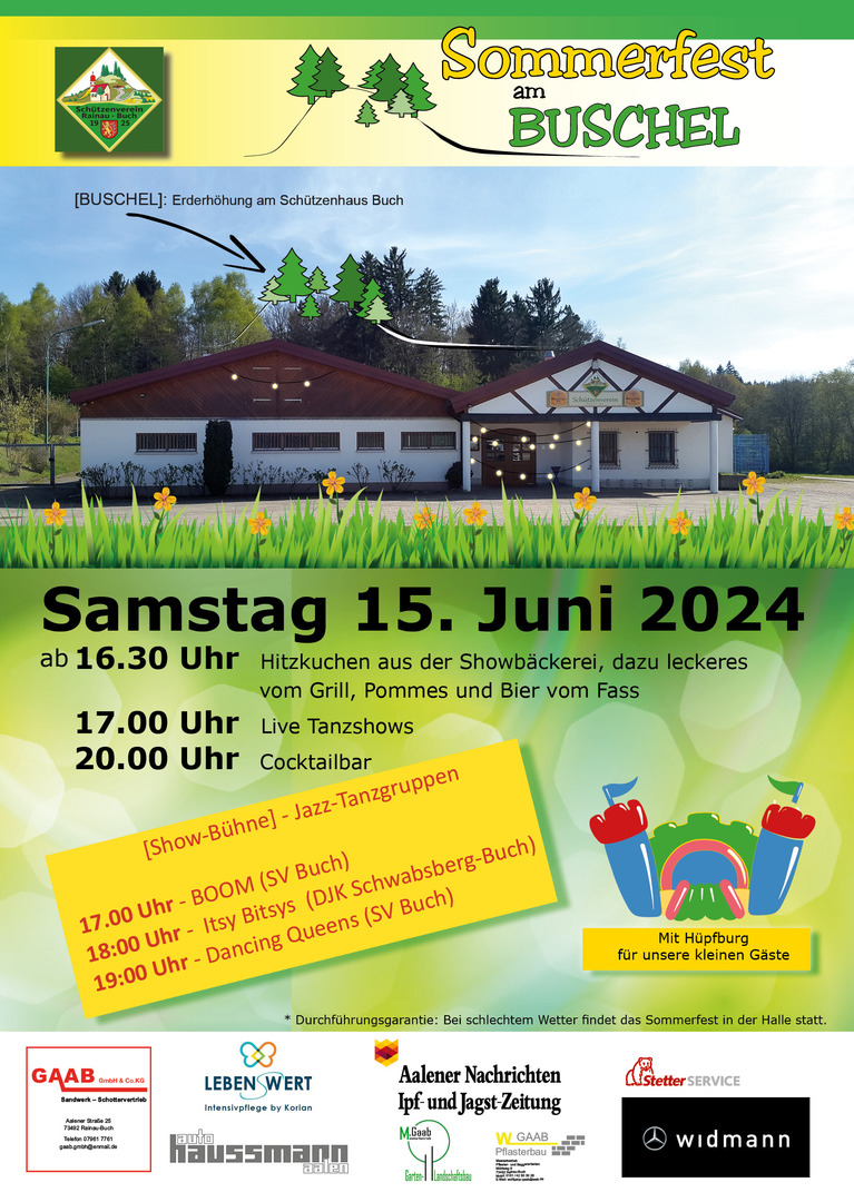 Ein Sommer ohne Feste wäre doch wie ein Geburtstag ohne Geschenke. Drum veranstaltet der Schützenverein Buch natürlich auch alle Jahre wieder sein Sommerfest zwischen Ende Mai und MitteJuni.